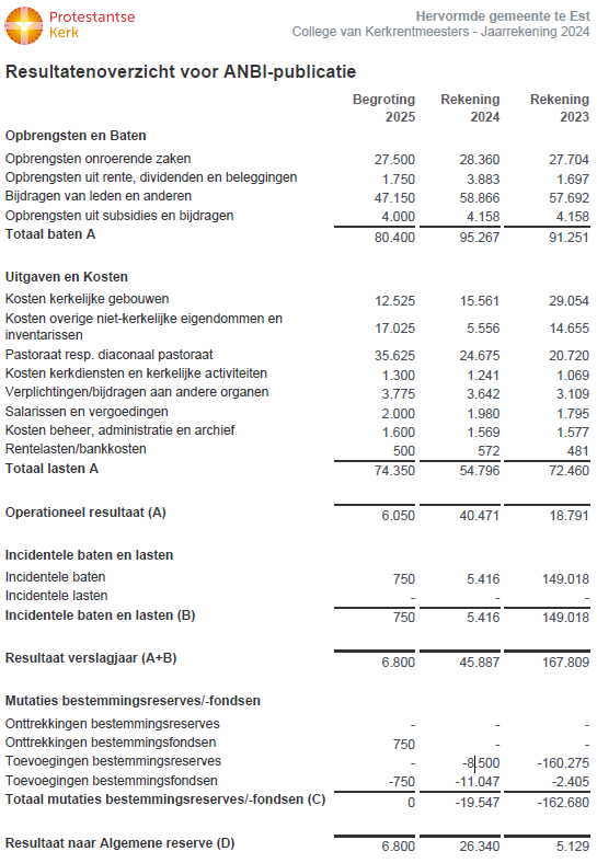 De Protestantse Kerk in Nederland heeft van de Belastingdienst een groepsbeschikking ANBI gekregen. Dat wil zeggen dat de afzonderlijke gemeenten en andere instellingen die tot dit kerkgenootschap behoren zijn aangewezen als ANBI. Dit is ook van toepassing op de Hervormde Gemeente te Est.
